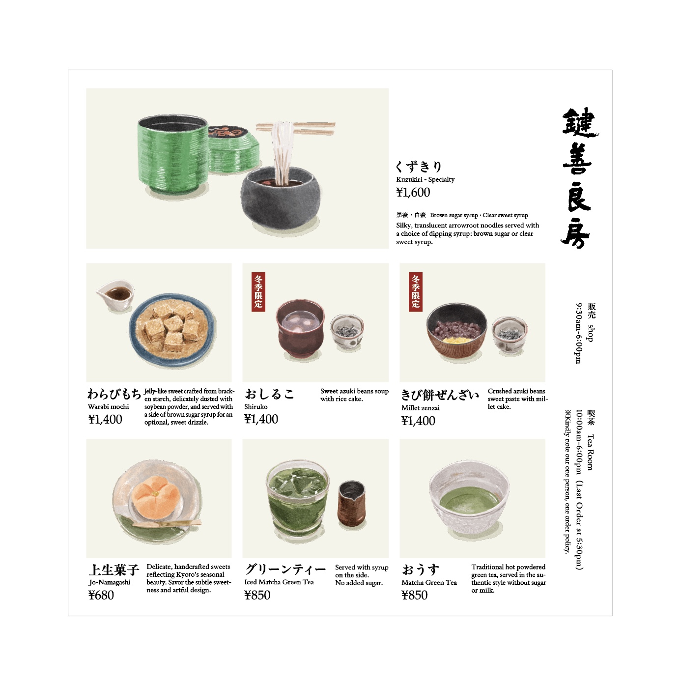 京都・祇園で300年以上の歴史を持つ老舗菓子店・鍵善良房の店舗内外におけるメニューのグラフィックデザイン。