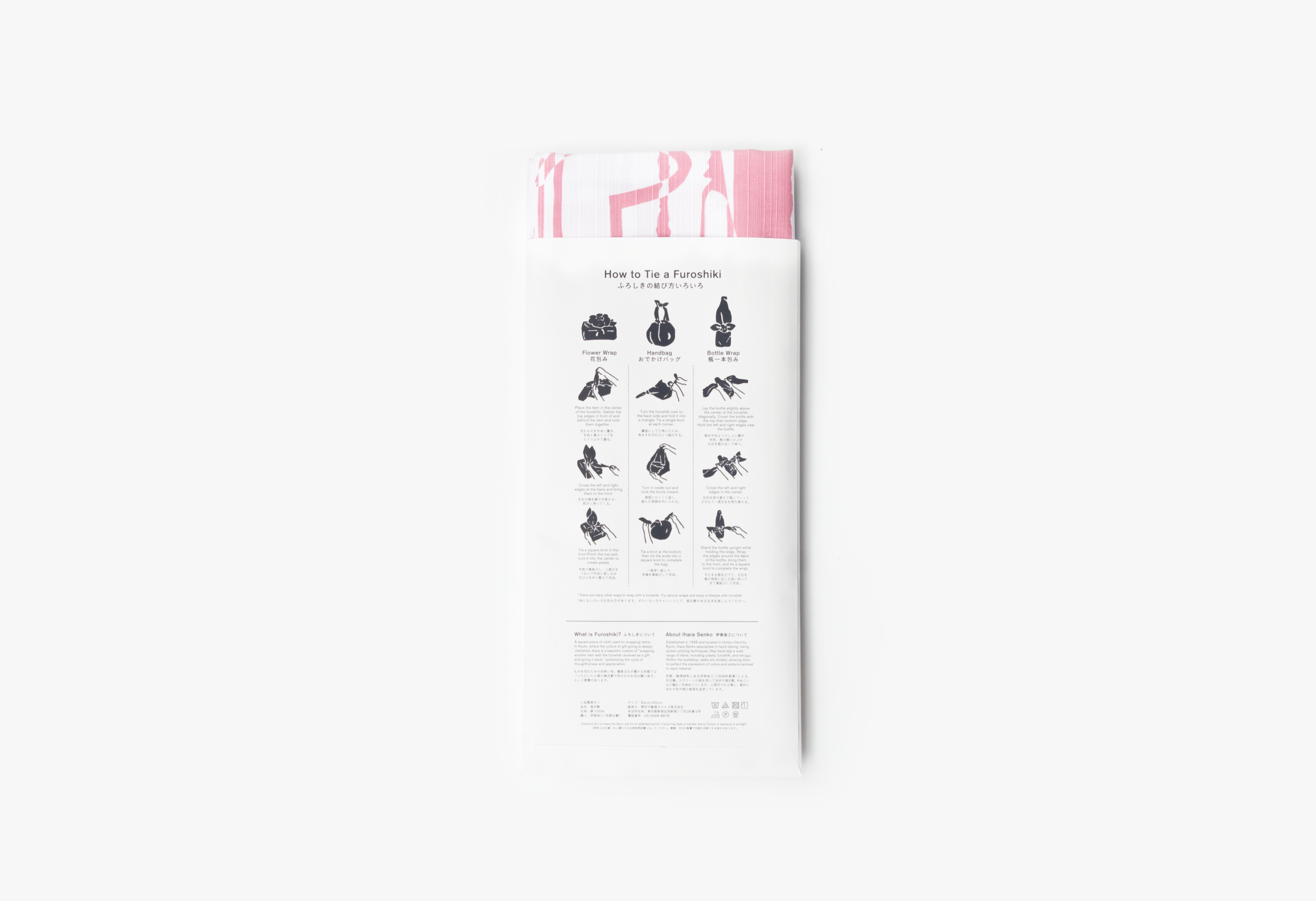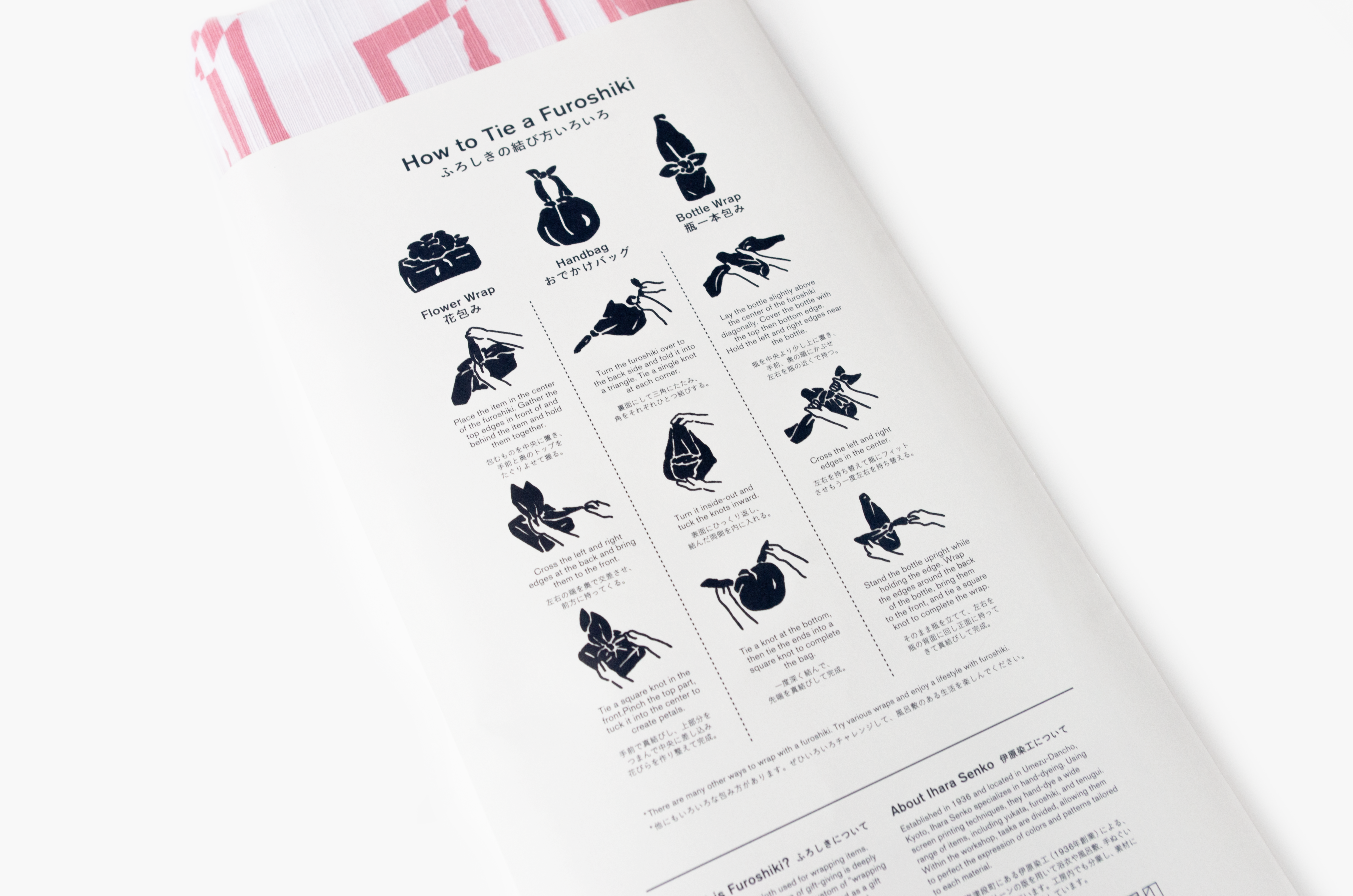 ビジュアル面では、風呂敷本体のデザインに影響しないようシンプルに。イラストは手描きの風合いを活かしつつも、わかりやすく、親しみやすい表現に仕上げている。情報量は最小限に抑えつつも、使い方まで自然に伝わるよう構成を工夫した。